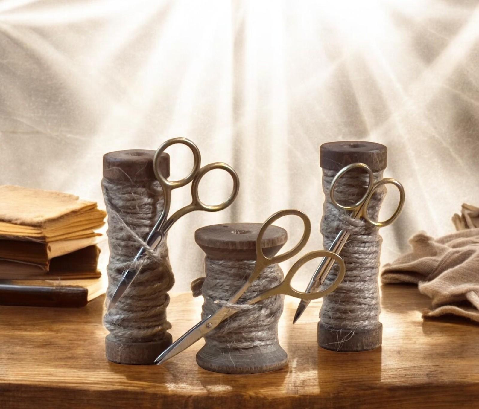 This listing is for one (1) vintage wood spool with twine and gold handle mini scissors.
