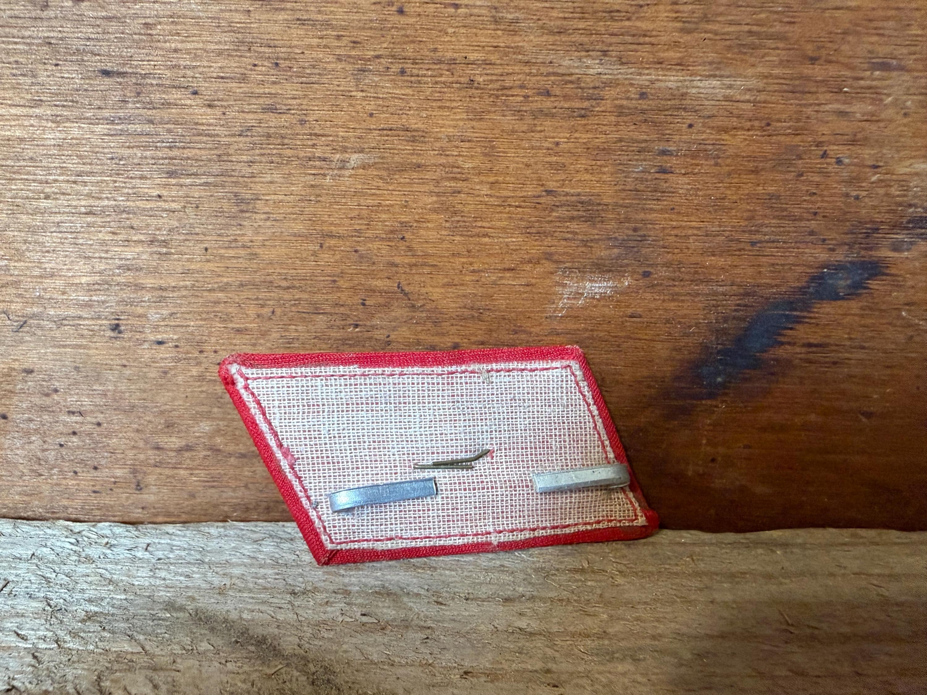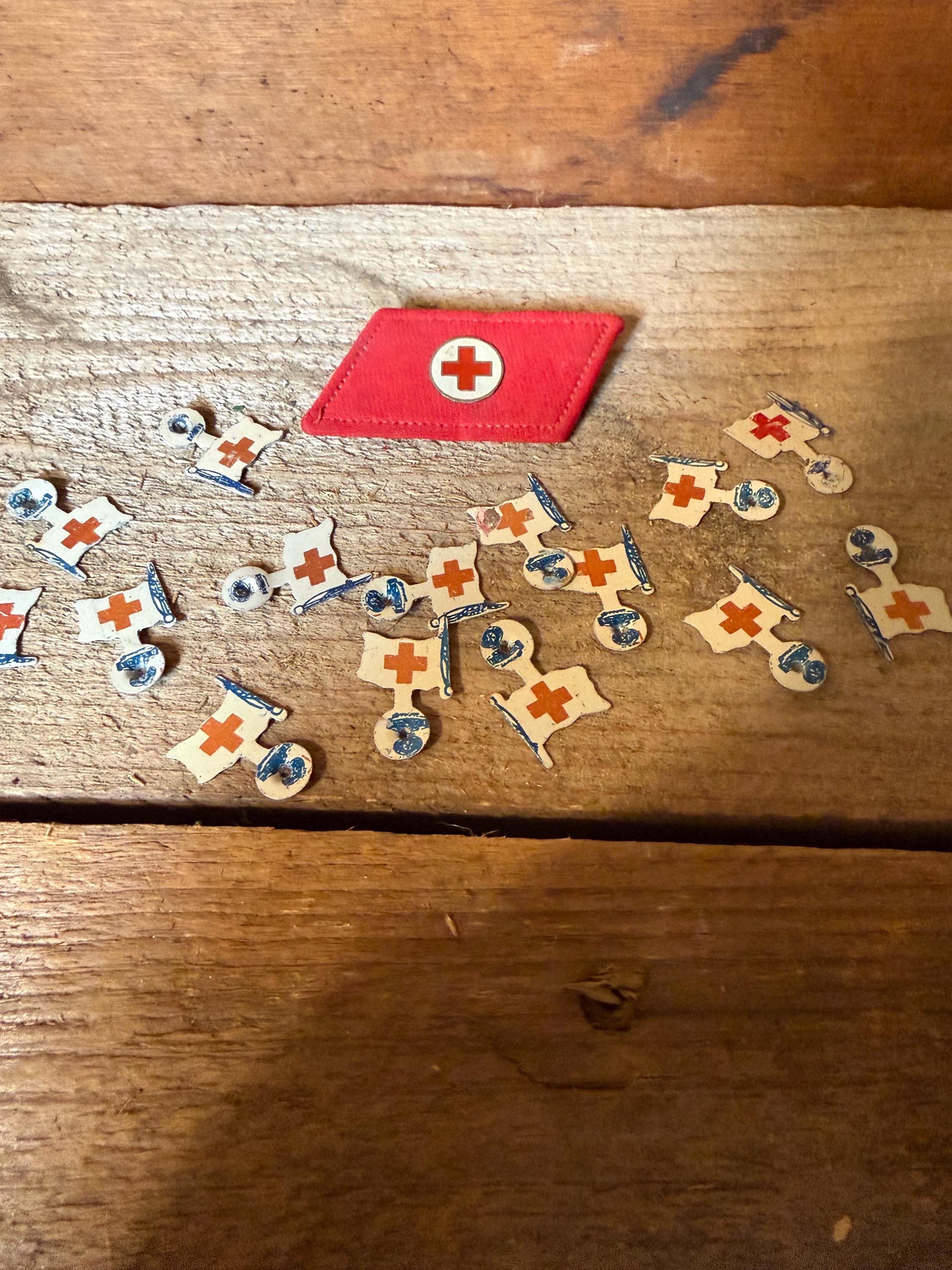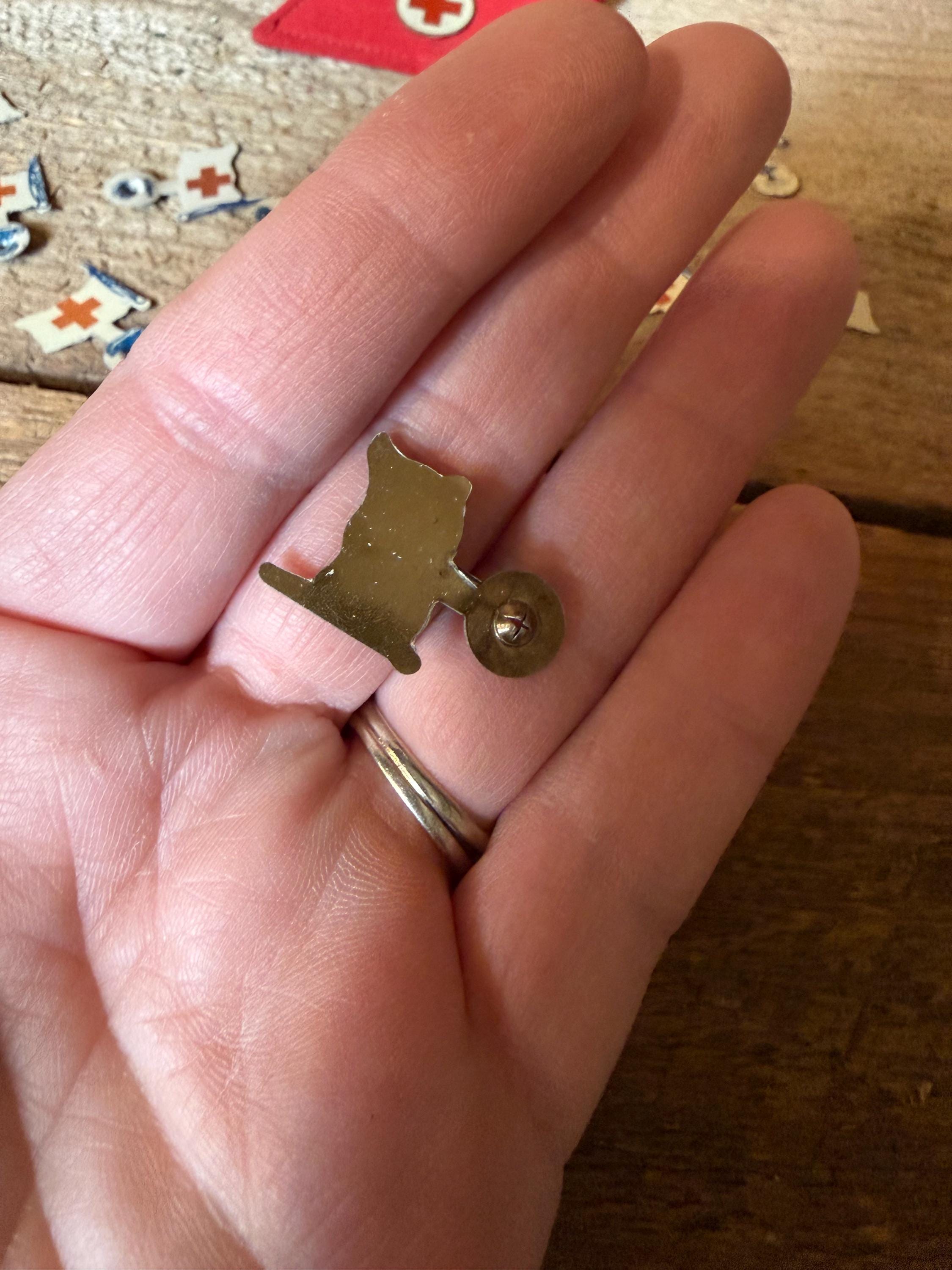 These beautiful fold back pins tell a story of love and war. These were handed out by the Red Cross during WWII as promotional items. The large red pin is also available but there is only 1. This pin has tabs that fold over the label, no pins on back.