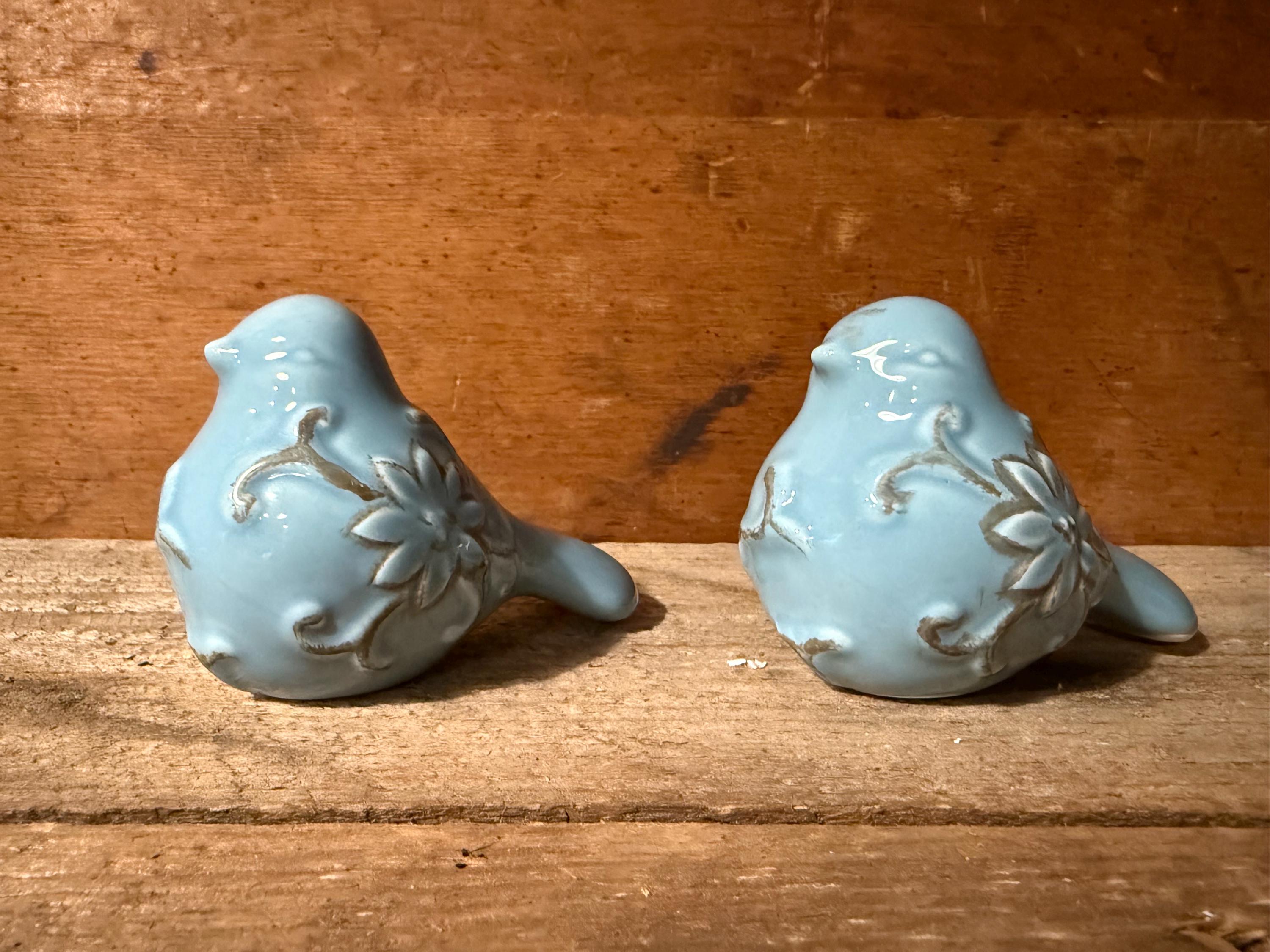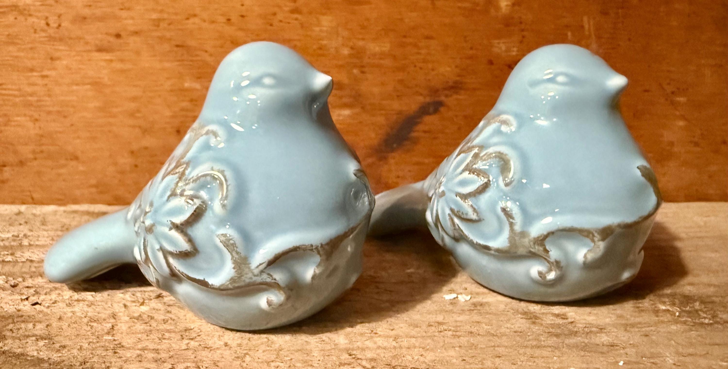 A pretty little pair of birds to sit just about anywhere and brighten up someone's day. This listing is for a set (two) 2 birds. Made of high-quality glazed ceramic, they are sturdy. Free of chips and cracks. They are lightly distressed with a floral pattern.