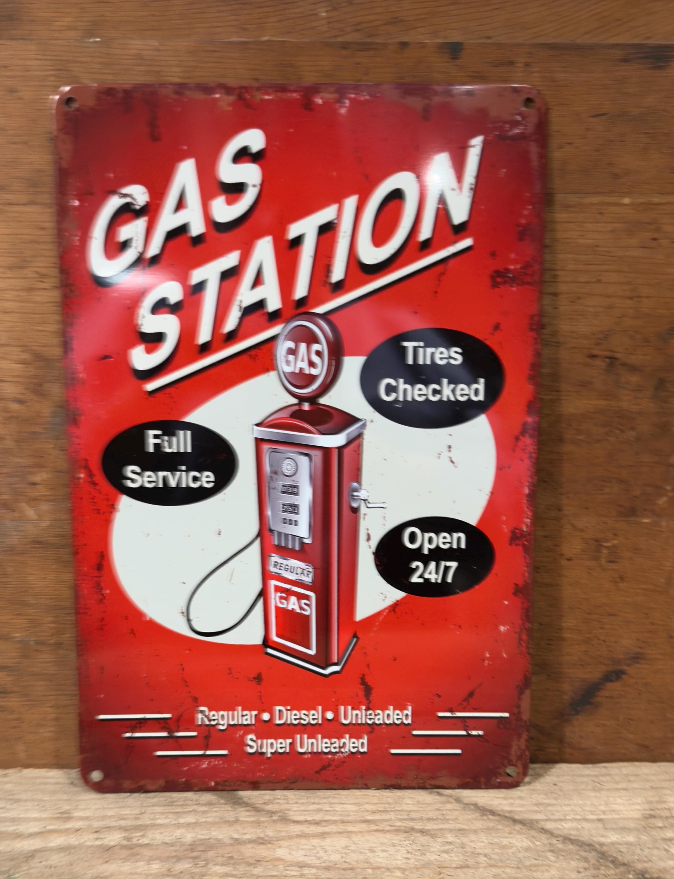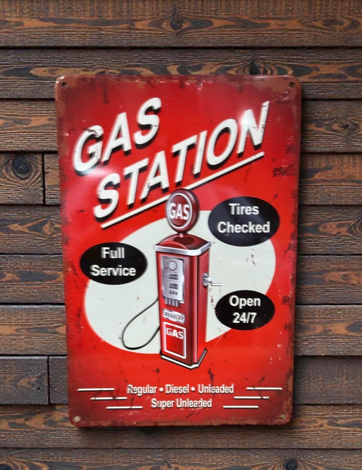 *This is a vintage style sign, not old. i purchased this sign for use in a photo shoot. It has not been used. Great graphics and colors! Perfect for a garage or man cave.