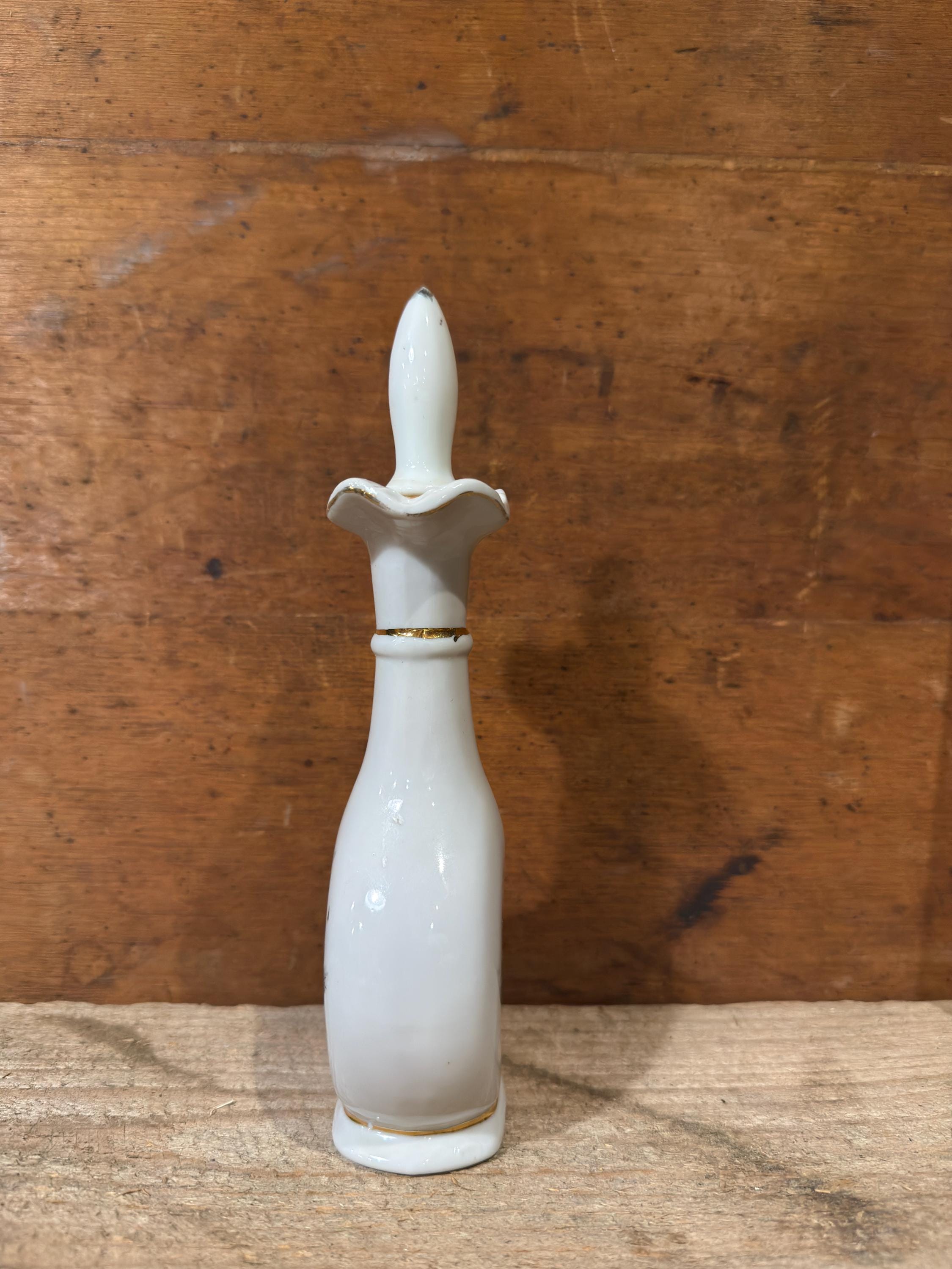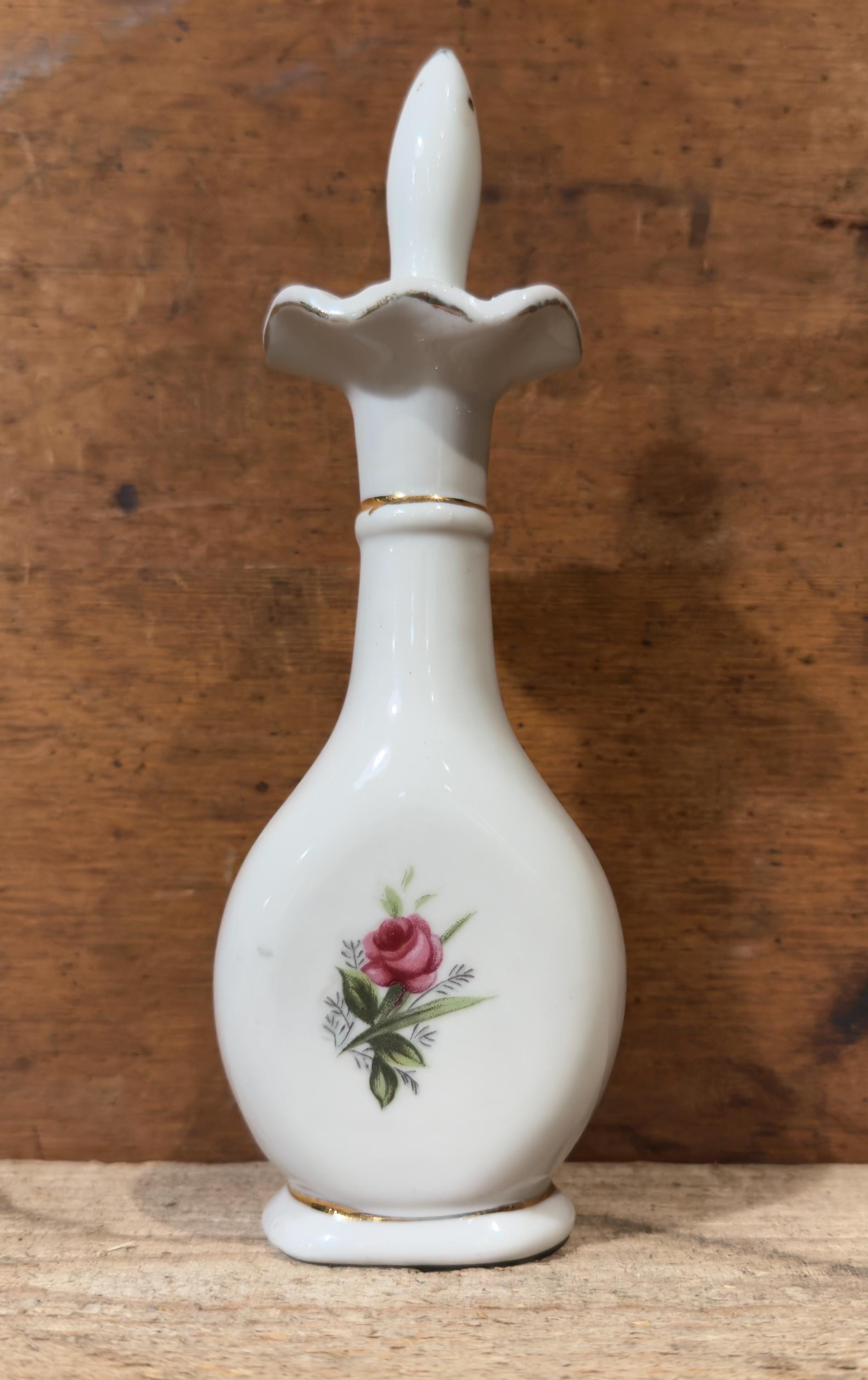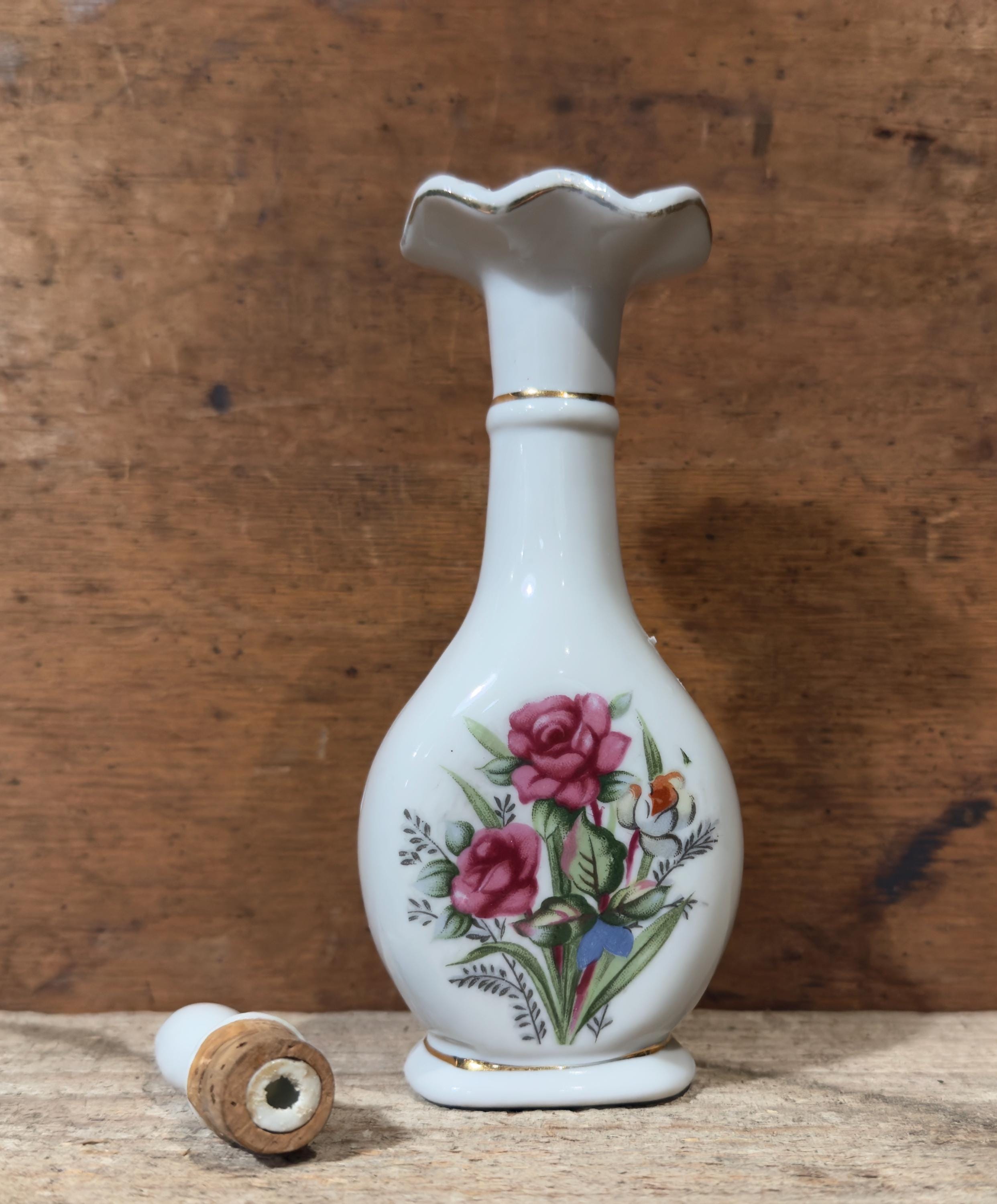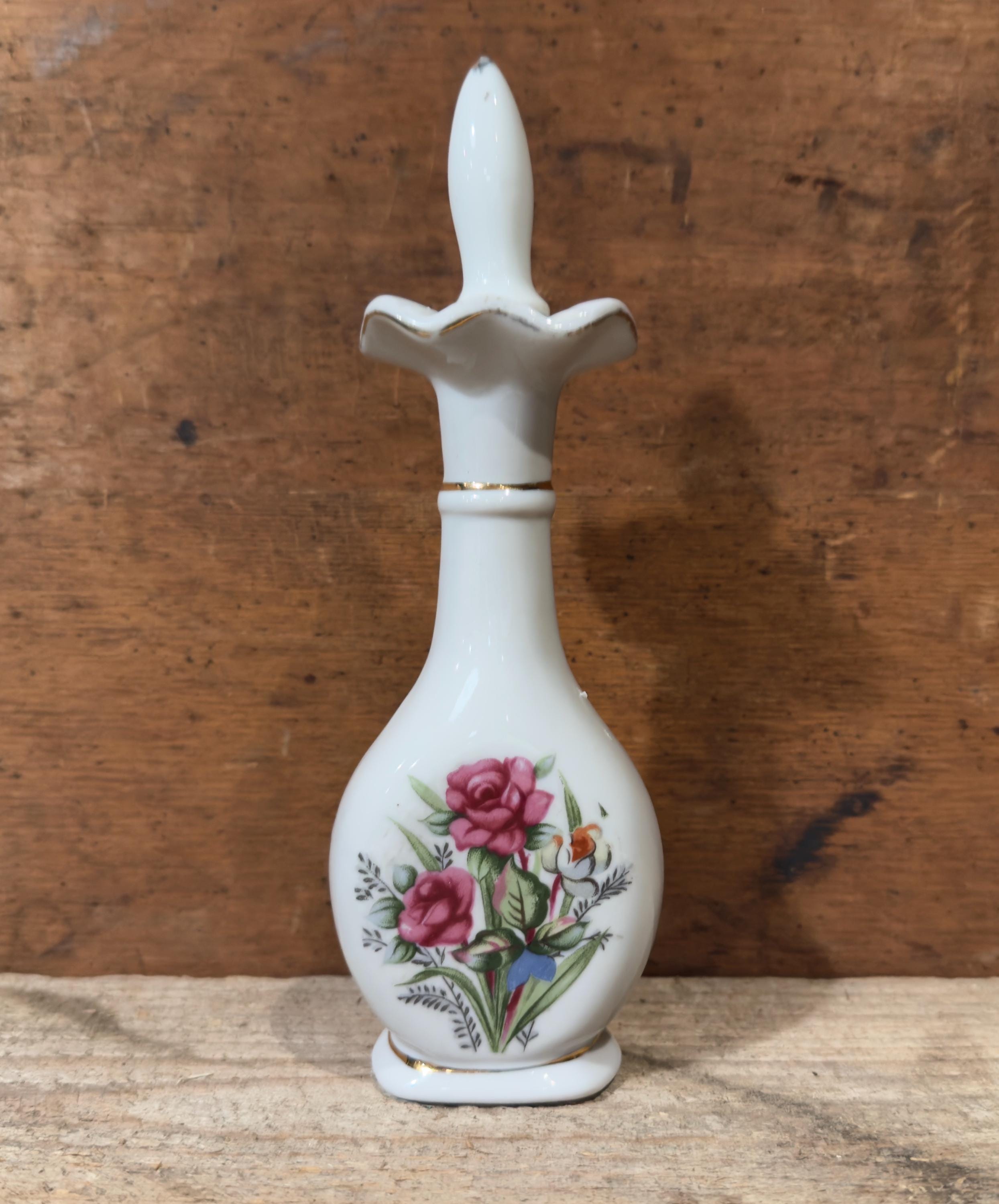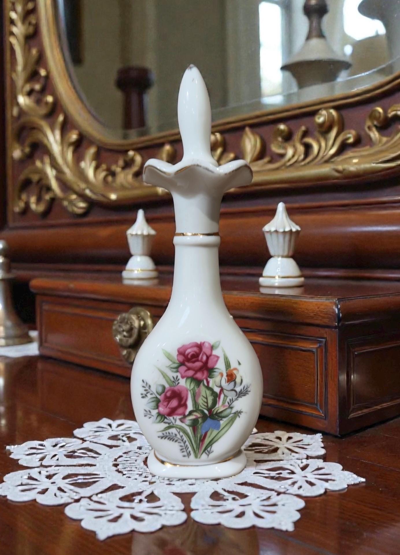 This is a beautiful vintage perfume bottle. It has a floral rose design on front and back. A ruffled top and a stopper with a cork on the end. There are no chips or cracks in this bottle. The gold-colored trim is intact with very minor wear. Overall, this bottle is just in beautiful condition for a mid-century origin.